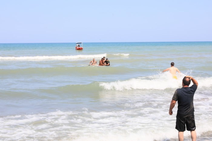 Amasya’dan aileleriyle kente gelen kardeşler Beyza (13) ve Nisa B. (15) ile kuzenleri Eren B. (14), Cumhuriyet Mahallesi Çobanlı İskelesi civarında denize girdi.