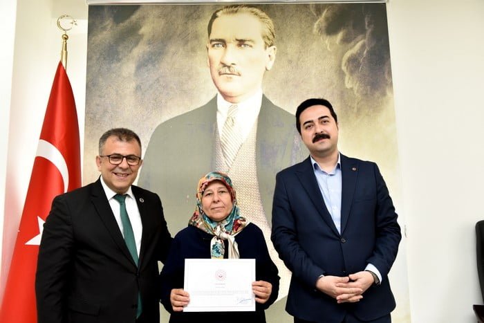 Kursun kapanışında düzenlenen törende Satiye Çatal, belgeyi oğlu Taşköprü Belediye Başkanı Abdullah Çatal’dan aldı.