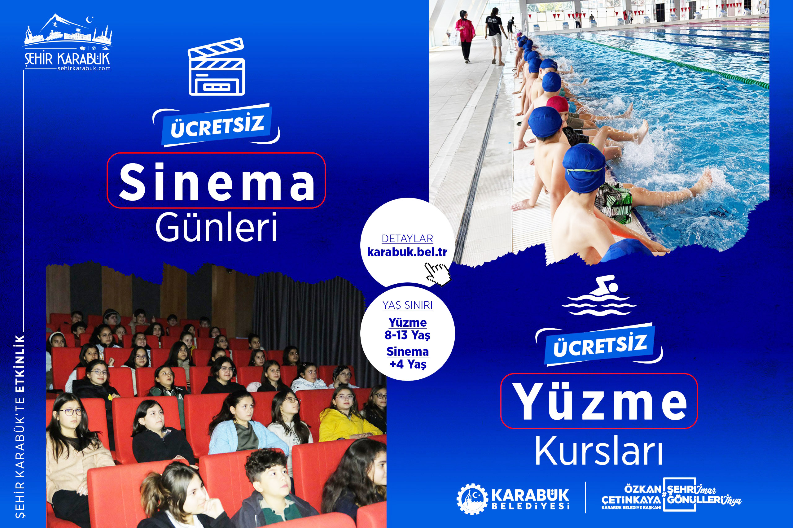 Karabük Belediyesi tarafından çocukların fiziksel ve sosyal gelişimlerine katkı sağlamak amacıyla düzenlenen ücretsiz yüzme kursları ve sinema etkinlikleri aralıksız devam ediyor.
