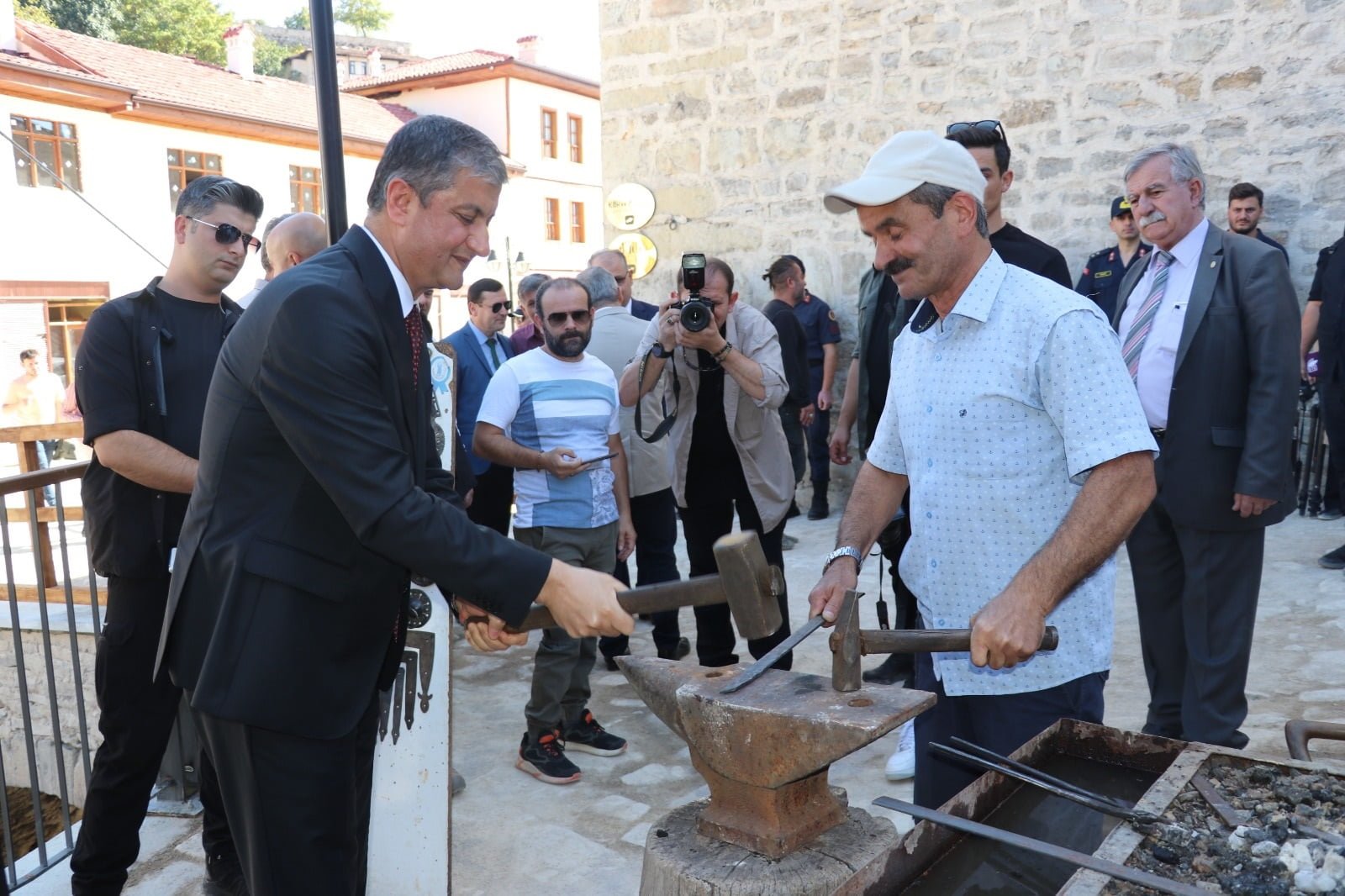 Ahilik pilavının da ikram edildiği programda Vali Yavuz, unutulmaya yüz tutmuş meslekleri icra eden zanaatkarları ziyaret etti, demir dövdü.