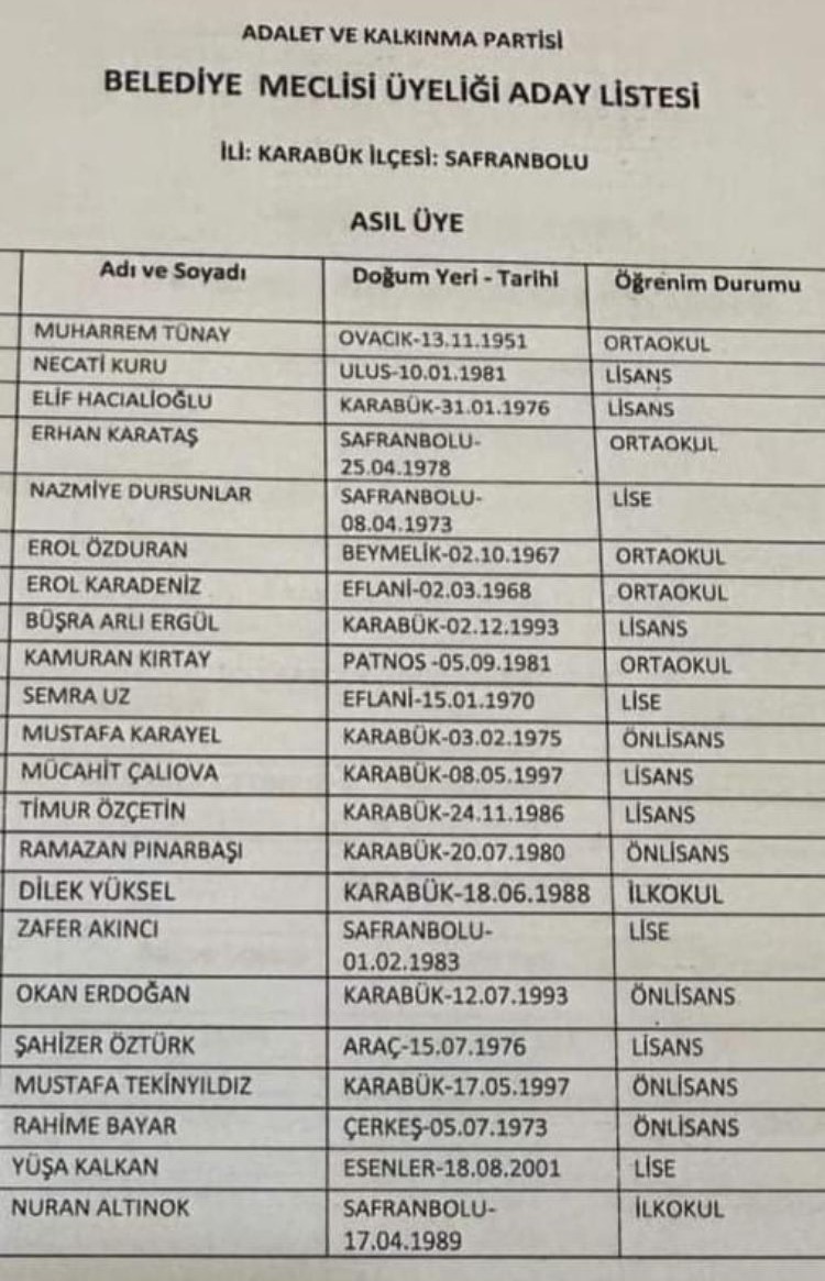 işte tartışmalar sonucu Safranbolu Belediyesi AK Parti Belediye Meclis listesi: