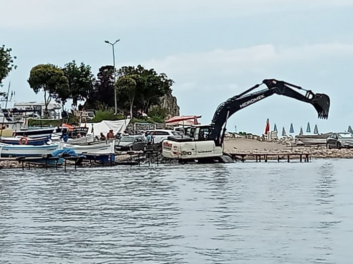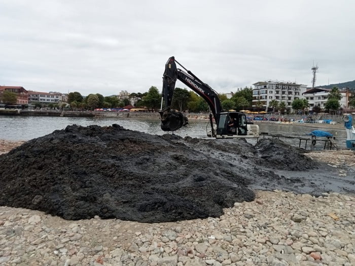İş makinaları ile denizden çıkartılan çamurlar kamyonlar ile başka alanlara sevk edilirken yan tarafta vatandaş yüzmeye devam etti.