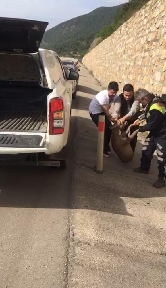 Kısa sürede olay yerine gelen ekipler, ön ayaklarının kırık olduğunu belirlediği karacayı araca alarak veteriner kliniğine götürdü.