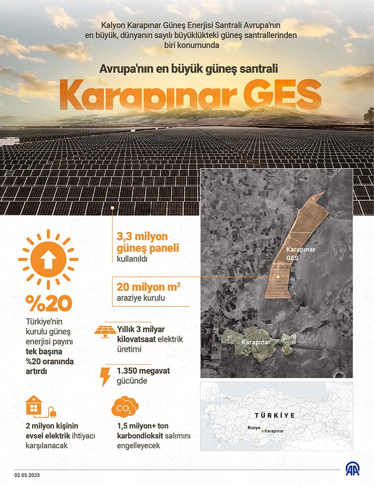 Kalyon Enerji’den aldığı bilgilere göre, kurulum çalışmalarına Ocak 2020’de başlanan Avrupa’nın en büyük, dünyanın sayılı büyüklükteki güneş santrallerinden biri olan Kalyon Karapınar GES, 20 milyon metrekare araziye kuruldu.