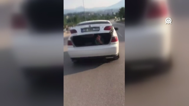 Karabük-Safranbolu kara yolunda seyreden sürücü, 78 ABR 117 plakalı otomobilinin bagajına bindirdiği çocukla kapağı açık şekilde trafikte yolculuk yaptı.