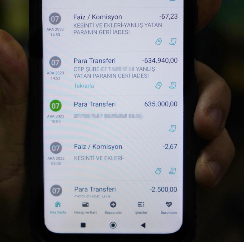 Kastamonu’da ticaretle uğraşan 41 yaşındaki Ramazan Ahlatçıoğlu telefonundaki “Hesabınıza 635 bin TL geldi” bildirimini görünce şoke oldu. Ahlatçıoğlu, Bayram Kılıç isimli bir vatandaş tarafından hesabına yatırılan yüklü miktardaki parayı incelediği sırada banka şubesinden arandı. Paranın iadesini istediklerini beyan eden banka şubesindeki personele, parayı iade edeceğini söyledi. Son günlerde yaşanan dolandırıcılık ve hesaplara illegal paraların aktarılmasından şüphelenen Ramazan Ahlatçıoğlu, Kastamonu Adalet Sarayına giderek Cumhuriyet savcısıyla görüştü. Adliyede tutanak tutturan Ramazan Ahlatçıoğlu, açıklama kısmı boş bırakılan ve dekontun üzerinde hiçbir bilginin olmadığı 635 bin TL’yi, kendisine gönderilen hesaba iade etti.