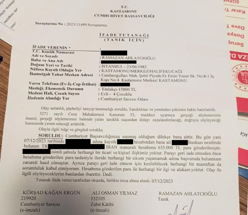 Yaşanan olayı anlatan Ramazan Ahlatçıoğlu, “Telefonuma bakarken o sırada bir para transferi olduğunu gördüm. Hesaplarımı incelediğim zaman tanımadığım bir şahıstan tarafıma para transferi yapıldığının farkına vardım. Araştırmak üzere hesaplarıma bakarken bankadan arandım. Banka personeli kadın, yanlış bir işlem olduğunu ve kendilerine aktarılan bir paranın sahibinin yanında olduğunu ve parayı geri aktarmamızı istedi. Tabii ki günümüz şartlarında bir sürü illegal işler döndüğü için açıklaması olmayan bir parayı direk olarak geri iade etmek istemedik. Bunun neticesinde savcılık ile görüşmek istedim. Savcılığa giderek açıklama kısmında herhangi bir not bırakılmadan tarafıma para transferi yapıldığını izah ettim. Bunun neticesinde doğabilecek sorumluluklardan üzerimize herhangi bir şekilde bizlere yansımasını istemediğimiz için ne yapmamız gerektiğini sordum. Bunun üzerine savcı beyin talimatıyla bir tutanak tutularak parayı kayıtlara geçtik. Ondan sonra ben, vatandaşın parasını iade ettim” dedi.