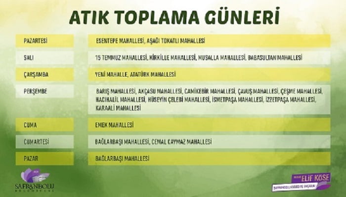 Müdürlükten yapılan açıklamada ise Atık Toplama Günleri şöyle: