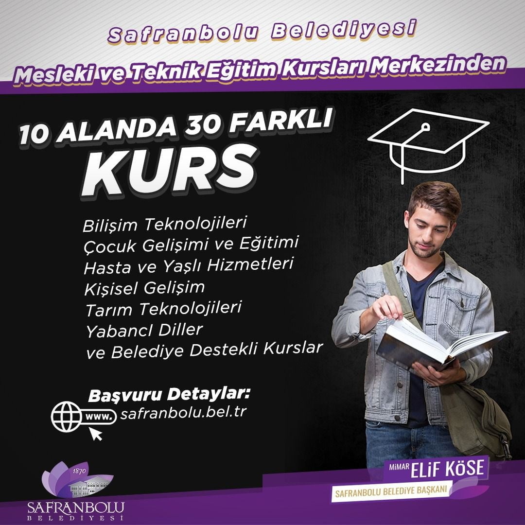 Safranbolu Belediyesi bünyesinde kurulan Mesleki Teknik Eğitim Kursları Merkezi bünyesinde Yabancı Dilden Bilim Teknolojilerine, Kişisel Gelişimden, Tarım Teknolojilerine kadar pek çok alanda verilecek eğitimlerin kayıtları başlıyor.