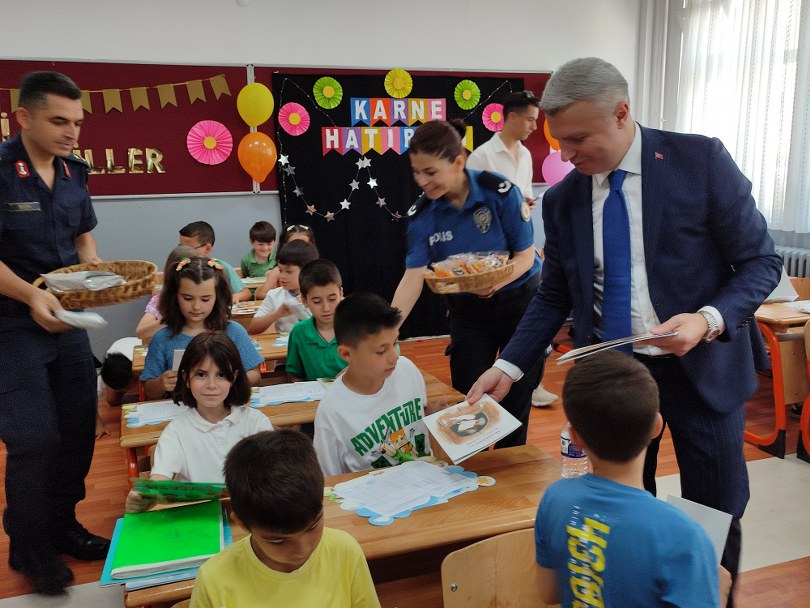Sınıfları dolaşan Vali Yavuz ve Akbaş, öğrencilere karnelerini ve kitaplarını dağıtarak, öğrencilerin sevinçlerine ortak oldular.