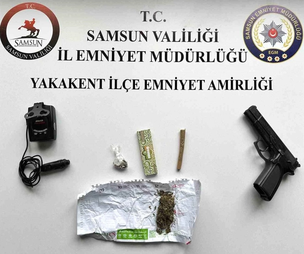 Yakakent ilçe Emniyet Müdürlüğü ekipleri, Liman Mahallesi’ndeki uygulama sırasında araçlarda arama yaptı. Ekipler, bir araçta yaptıkları aramada radar tespit cihazı ile kurusıkı tabanca, bir başka araçta ise 1 gram kenevir tohumu, 2,1 gram esrarlı sigara ve 8,8 gram esrar ele geçirdi.