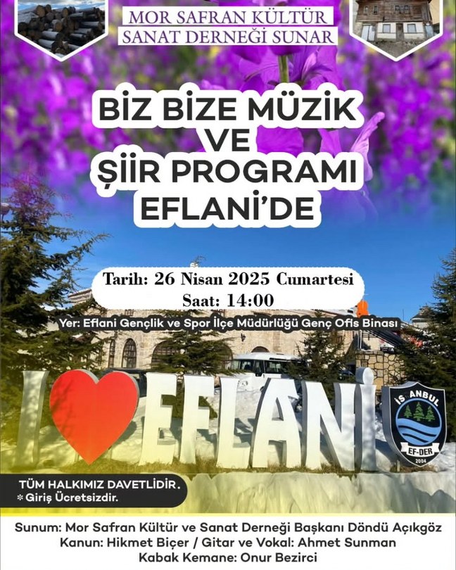 Mor Safran Kültür Sanat Derneği tarafından aylardır düzenlenen ve geleneksel hale getirilen ‘Biz Bize Müzik ve Şiir’ programının 22.’si 26 Nisan Cumartesi günü Eflani’de düzenlenecek.