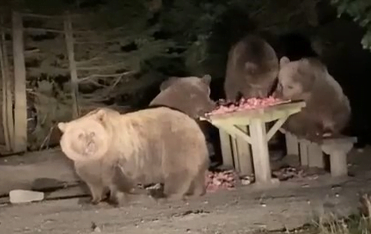 Ayıların bu davranışı üzerine, ormanın yanı başındaki banklara esnaflar et koyarken, 4 kişilik ayı ailesinin yemek ziyafeti kameralara yansıdı.