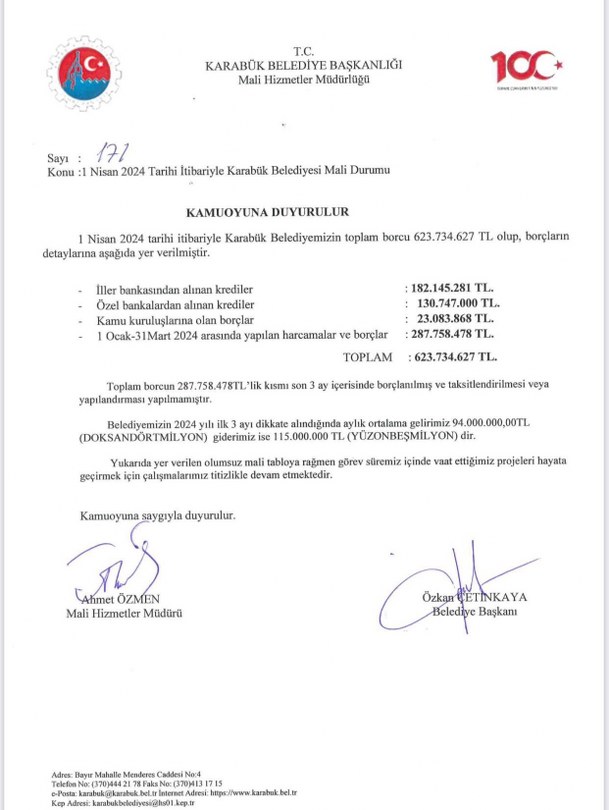 31 Mart seçimleri sonrası MHP’li Belediye Başkanından koltuğu devralan AK Partili Karabük Belediye Başkanı Özkan Çetinkaya, 1 Nisan 2024 tarihi itibariyle belediyenin toplam borcunun 623 milyon 734 bin 627 TL olduğu belirtti. Başkan Çetinkaya yaptığı açıklamada, “Belediyemizin kalem kalem borçları ise şu şekildedir: İller bankasından alınan krediler 182 milyon 145 bin 281 TL, özel bankalardan alınan krediler 130 milyon 747 bin TL, kamu kuruluşlarına olan borçlar 23 milyon 83 bin 868 TL.” dedi.