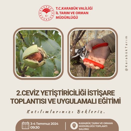 Karabük Valiliği İl Tarım ve Orman Müdürlüğü, ceviz yetiştiriciliği konusunda ikinci istişare toplantısı ve uygulamalı eğitim düzenleyecek. Toplantılar, 3-4 Temmuz tarihlerinde Karabük Tarım ve Orman Müdürlüğü toplantı salonunda gerçekleştirilecek. Müdürlükten yapılan açıklamada, “Tüm ilgililerin katılımlarını bekleriz” denildi.
