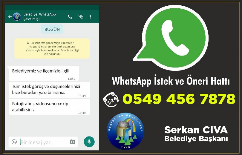 Eskipazar Belediyesi WhatsApp İhbar Hattı ile ilgili olarak Eskipazar Belediyesi’nden yapılan açıklamada, “Siz vatandaşlarımıza daha hızlı ve daha iyi hizmet verebilmek amacıyla istek, şikayet ve önerilerinizi ulaştırabilmeniz için Whatsapp İhbar Hattımız hizmete girmiştir. Artık şikayetlerinizi belediyemize gelmeden fotoğraf çekerek veya yazılı olarak bildirecek ve WhatsApp üzerinden belediyemizle irtibata geçebileceksiniz. WhatsApp ihbar hattımız: 0549 456 7878” denildi.
