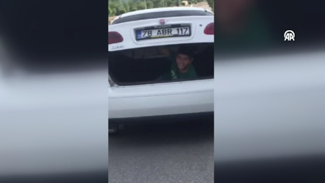 Karabük-Safranbolu kara yolunda seyreden sürücü, 78 ABR 117 plakalı otomobilinin bagajına bindirdiği çocukla kapağı açık şekilde yolculuk yaptı.