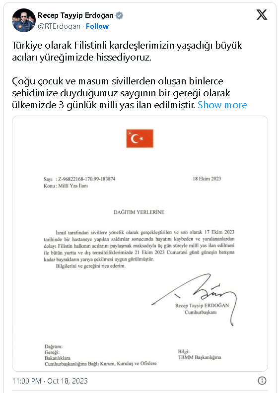 Cumhurbaşkanı Erdoğan, sosyal medya hesabından yaptığı paylaşımda, “Türkiye olarak Filistinli kardeşlerimizin yaşadığı büyük acıları yüreğimizde hissediyoruz. Çoğu çocuk ve masum sivillerden oluşan binlerce şehidimize duyduğumuz saygının bir gereği olarak ülkemizde 3 günlük millî yas ilan edilmiştir.” ifadelerini kullandı.