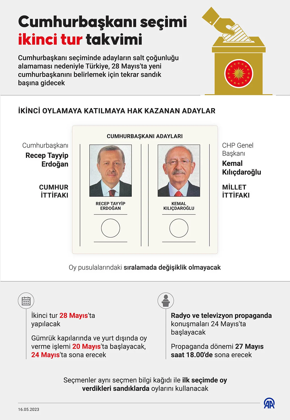 Cumhurbaşkanı seçiminde adayların salt çoğunluğu alamaması nedeniyle Türkiye, 28 Mayıs’ta yeni cumhurbaşkanını belirlemek için tekrar sandık başına gidecek.