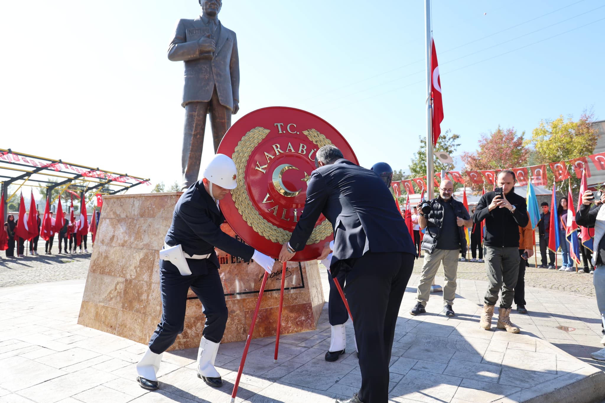 Karabük Valiliği, Karabük Belediye Başkanlığı ve Garnizon Komutanlığının çelenkleri Karabük Valisi Mustafa Yavuz, Karabük Belediye Başkanı Özkan Çetinkaya ve Karabük Garnizon Komutanı Vekili Bkm. Alb. Murat Gürcan tarafından Atatürk Anıtı’na sunuldu.