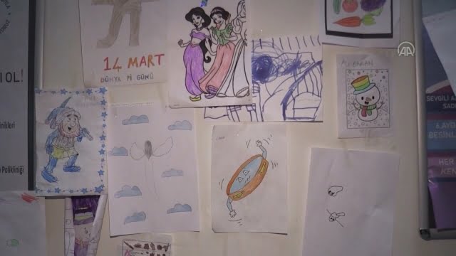 Hastaneye tedavi için gelen ailelerin bekleme alanında yer alan ve “Arkadaşlar iyi misiniz?” gibi yazıların da bulunduğu resimler, görenleri duygulandırıyor.