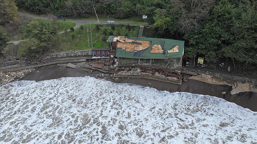 Deniz kenarında bulunan belediyeye ait 2 katlı turistik tesisin büyük bölümü, fırtına ve 5 metreye ulaşan dalgalar nedeniyle çöktü.