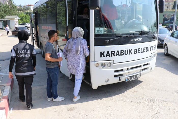 Karabük Üniversitesindeki fakülte binalarına aileleriyle gelen adaylar, güvenlik kontrolünün ardından salona alındı.