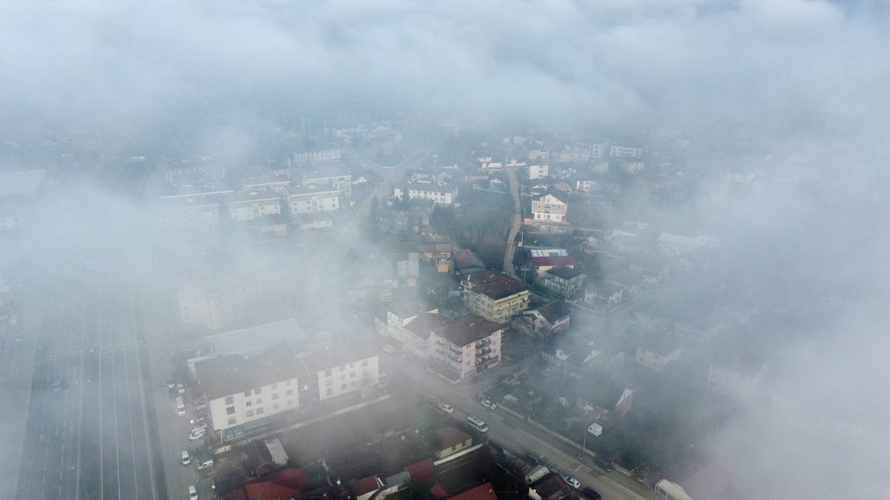 Kent merkezinde de etkili olan sisle kaplanan Düzce Ovası dronla görüntülendi.