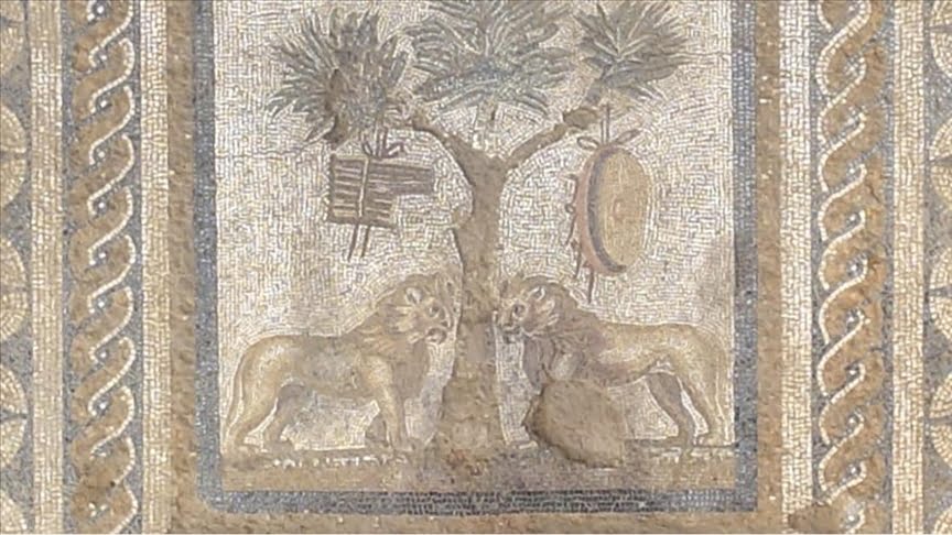 Tiyatronun üst kısmında bulunan alanda çalışan kazı ekibi, portikoya (üstü örtülü, önü sütunlu açık galeri) bağlı bir yapı içerisinde aslanlı mozaiğe rastladı.