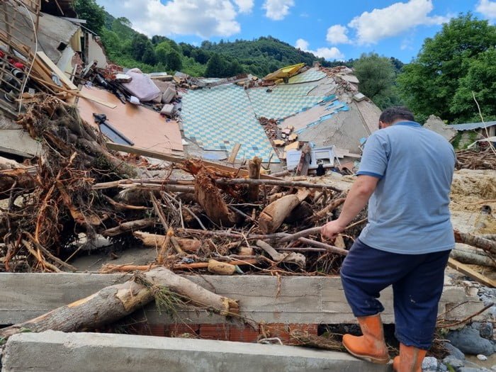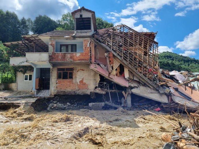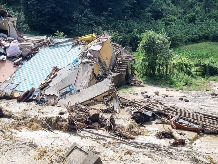 Öte yandan taşkın ve sel riskinin geçmesinin ardından bölgeye sevk edilen ekiplerin, evin enkazını kaldırma çalışmaları sürüyor.