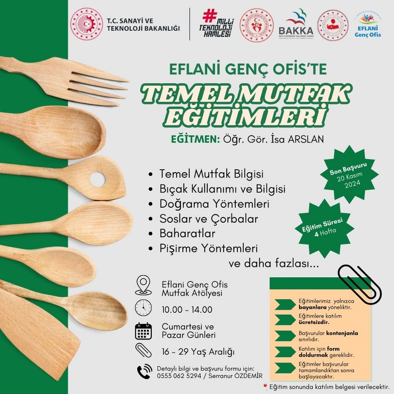 Temel Mutfak Eğitimleri, sadece bayanlara yönelik olarak 16-29 yaş arası katılımcılara ücretsiz sunulacak. Eğitimler, 4 hafta sürecek ve başvurular için son tarih 20 Kasım 2024 olarak belirlendi.
