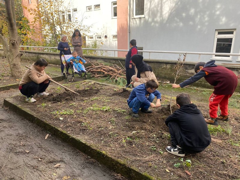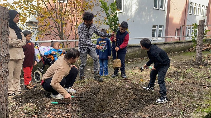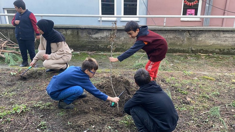 Okul bahçesinde gerçekleştirilen etkinlikte, öğrenciler kumkuat, limon ve aromatik tıbbi bitki fidanlarını toprakla buluşturdu.