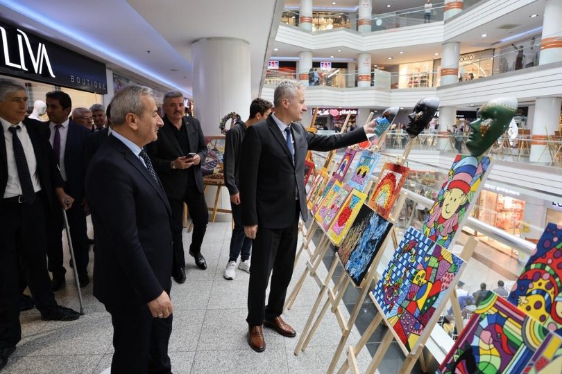 Protokol üyeleri, sergi açılışını yaptıktan sonra sergi alanını gezerek özel öğrencilerden ve öğretmenlerinden atölye çalışmaları sonucu ürettikleri ürünler ve yaptıkları resimler hakkında bilgi aldı.