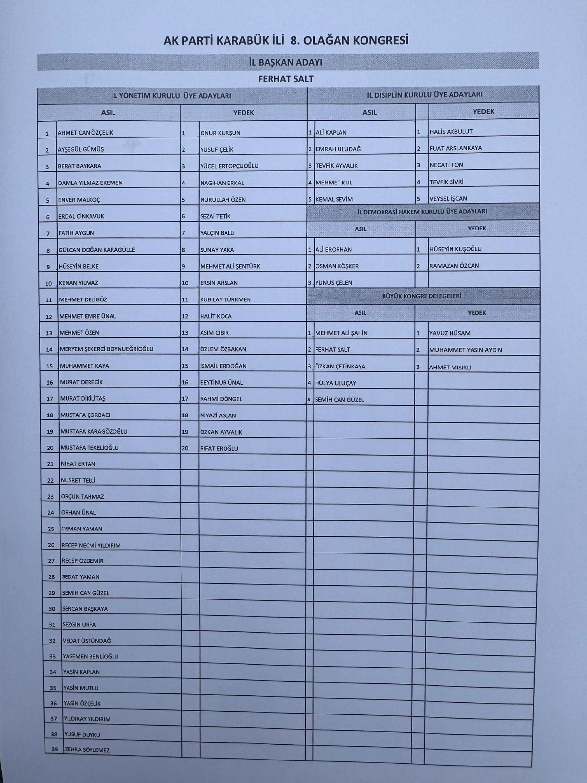 Ferhat Salt liderliğindeki AK Parti Karabük İl Başkanlığı’nın yeni yönetiminde 39 asıl üye belirlendi. Ahmet Can Özçelik, Ayşegül Gümüş, Berat Baykara, Damla Yılmaz Ekmen, Enver Malkoç, Erdal Cinkavuk, Fatih Aygün ve Gülcan D. Karagülle ve daha birçok ismin yer aldığı bu geniş kadro, partinin yerel siyasetteki etkisini artırmayı hedefliyor.