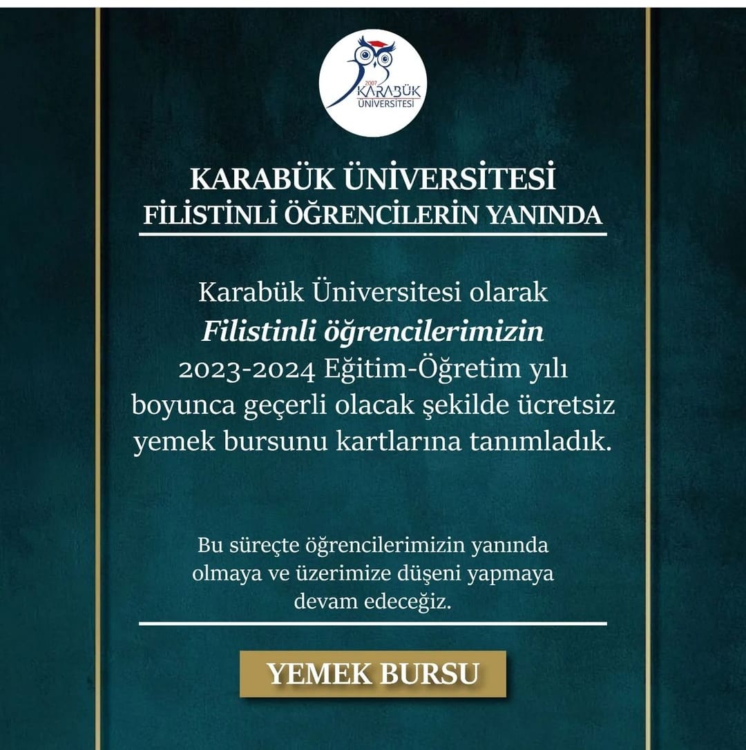 Filistinli öğrencilere ücretsiz yemek bursu verdiklerini sosyal medya hesaplarından duyurdu. Bu paylaşıma göre 2023-2024 eğitim yılı için Filistinli öğrencilerin öğrenci kartlarına ücretsiz yemek tanımlandığını duyurdu