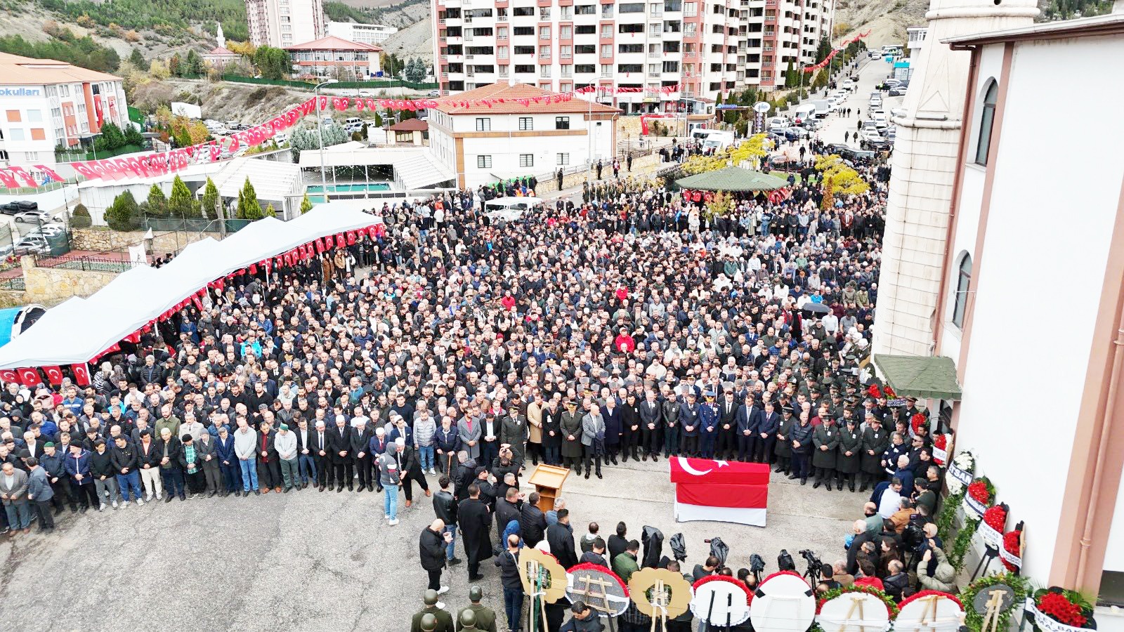 Cami Avlusunda Tabut Başında Toplanan binlerce kişi Adeta KALP Şeklinde durarak Seni Bağrımıza bastık Dercesine Dua ettiler
