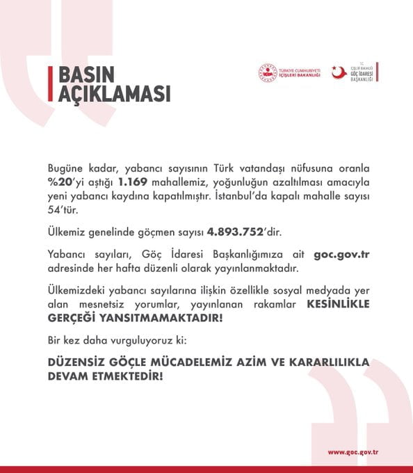 “Bugüne kadar, yabancı sayısının, Türk vatandaşı sayısına oranla yüzde 20’yi aştığı 1169 mahallemiz, yoğunluğun azaltılması amacıyla yeni yabancı kaydına kapatılmıştır. İstanbul’da kapalı mahalle sayısı 54’tür. Ülkemiz genelinde göçmen sayısı 4 milyon 893 bin 752’dir. Yabancı sayıları, Göç İdaresi Başkanlığımıza ait goc.gov.tr adresinde her hafta düzenli olarak yayımlanmaktadır. Ülkemizdeki yabancı sayılarına ilişkin özellikle sosyal medyada yer alan mesnetsiz yorumlar, yayımlanan rakamlar, kesinlikle gerçeği yansıtmamaktadır. Bir kez daha vurguluyoruz ki düzensiz göçle mücadelemiz, azim ve kararlılıkla devam etmektedir.”