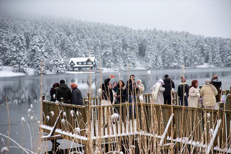 Günübirlik tatil için Gölcük’e gelen doğaseverler, göl çevresinde yürüyerek, iskelede fotoğraf çektirerek kar manzarasının tadını çıkardı.