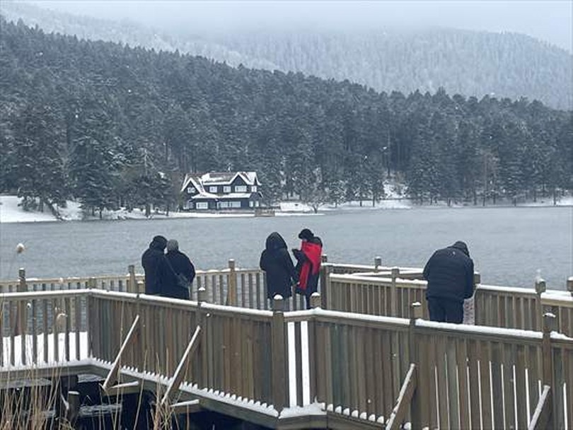 Tabiat parkına gelenler, göl çevresinde yürüyüş yaparak ve iskelede fotoğraf çekerek kar manzarasının keyfini çıkardı.