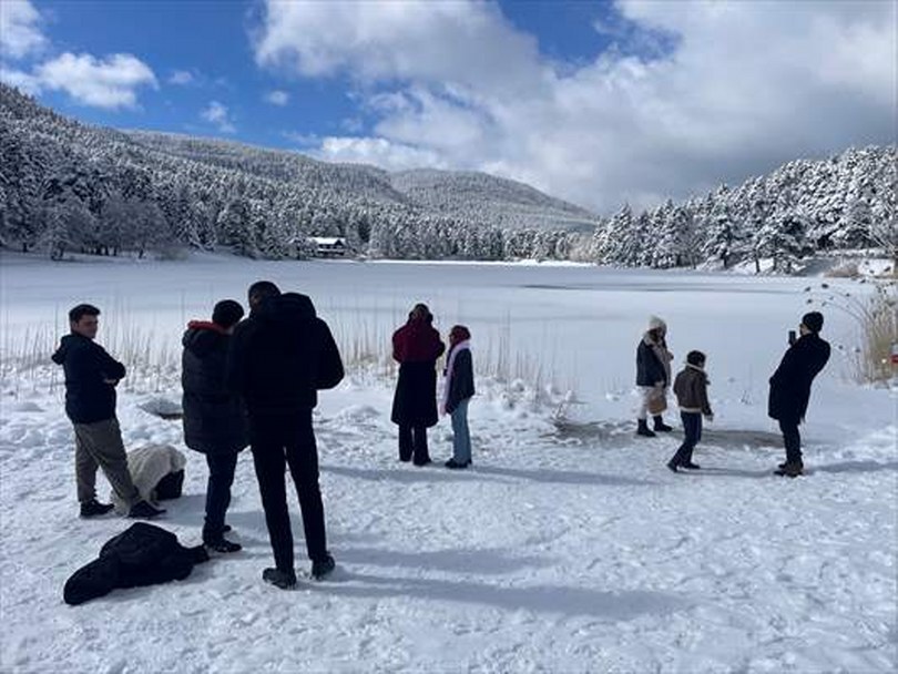 Bölgeye gelen tatilciler, yüzeyi buzla kaplı göl çevresinde yürüyüş yaptı, iskelede fotoğraf çektirdi, kızak ve şambriyellerle kaydı.