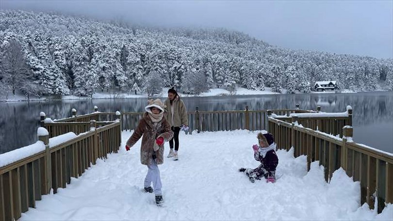 Soğuk hava ve zorlu yola rağmen Gölcük’e gelen tatilciler, beyaz örtüye bürünen ağaçların gölle oluşturduğu ahengi seyretme fırsatı buldu.