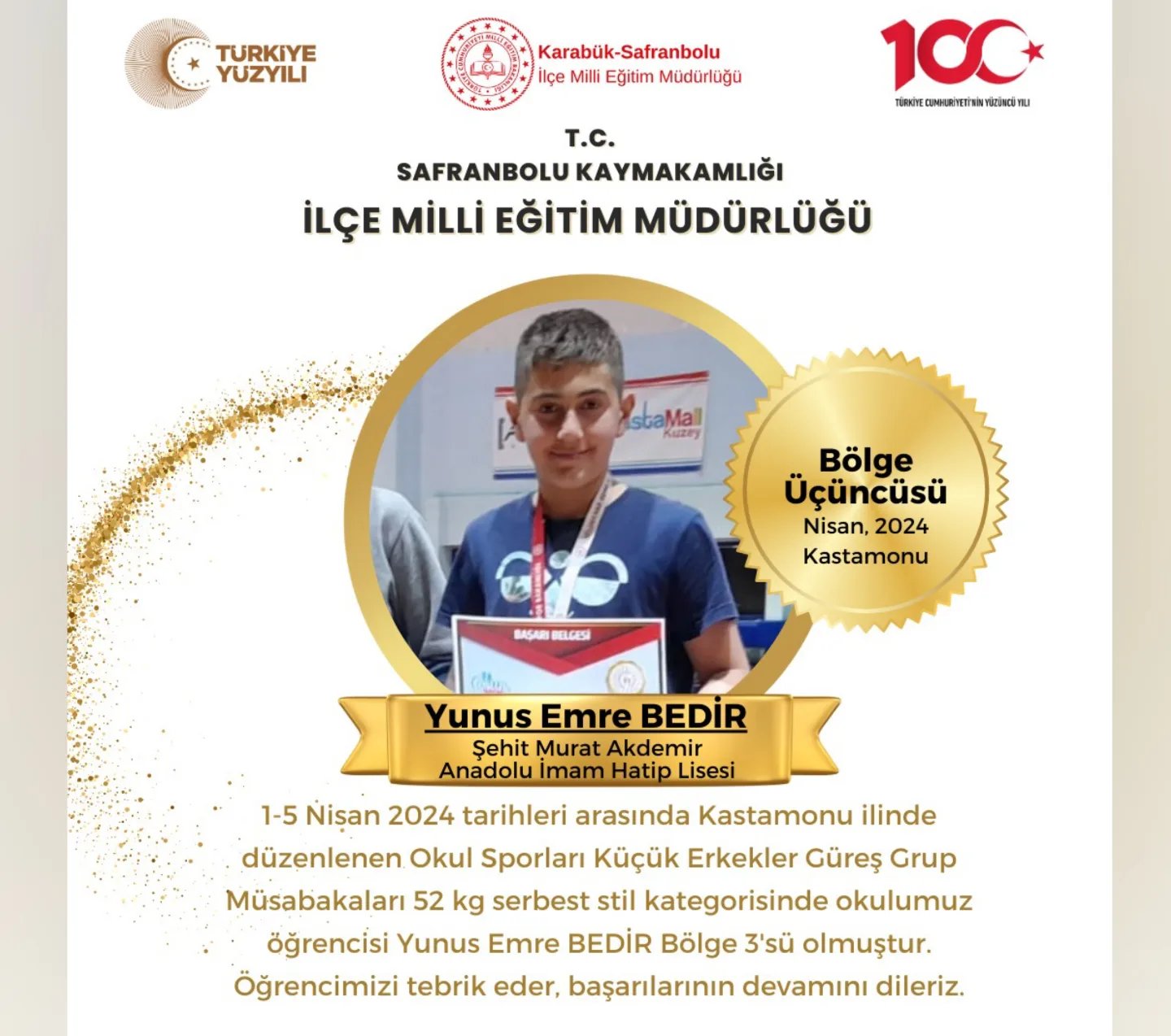 Şehit Murat Akdemir Anadolu İmam Hatip Lisesi öğrencisi Yunus Emre Bedir, 1-5 Nisan 2024 tarihleri arasında Kastamonu ilinde düzenlenen Okul Sporları Küçük Erkekler Güreş Grup Müsabakalarında 52 kg Serbest Stil Kategorisinde Bölge 3.sü oldu.