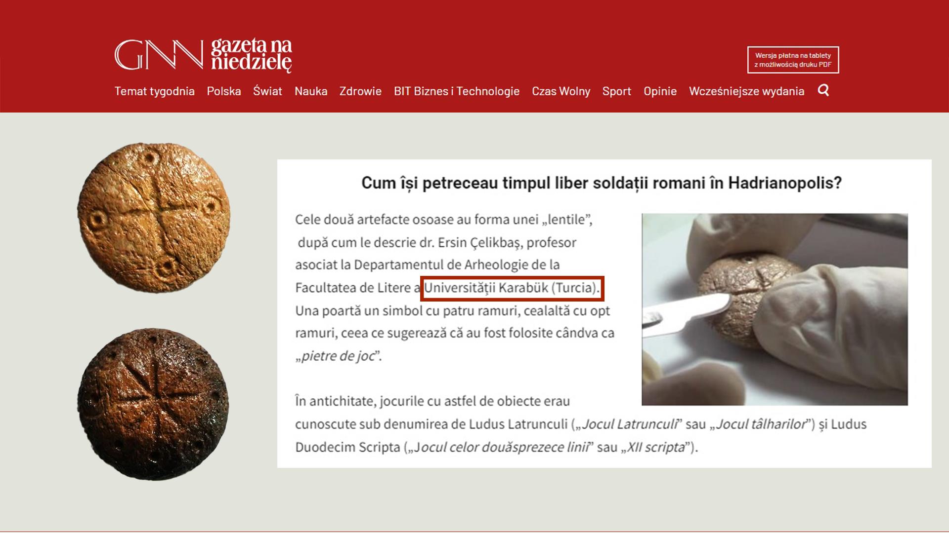 Karabük Üniversitesi Edebiyat Fakültesi Arkeoloji Bölümü Öğretim Üyesi Doç. Dr. Ersin Çelikbaş başkanlığında Hadrianopolis Antik Kenti’nde yürütülen kazılarda 5. yüzyıla ait oyun taşları gün yüzüne çıkarılmıştı. KBÜ Medyanın bilimsel keşifle ilgili bu haberi dünya basınının ilgisini çekmeye devam ediyor. Söz konusu haber Almanya, Fransa, İspanya, Polonya ve Romanya’da yayın yapan La Brújula Verde, Futurezone, Ordinea Zilei, Gazeta na Niedzielę, GEO, Arkeonews gibi uluslararası mecralarda da yer aldı.