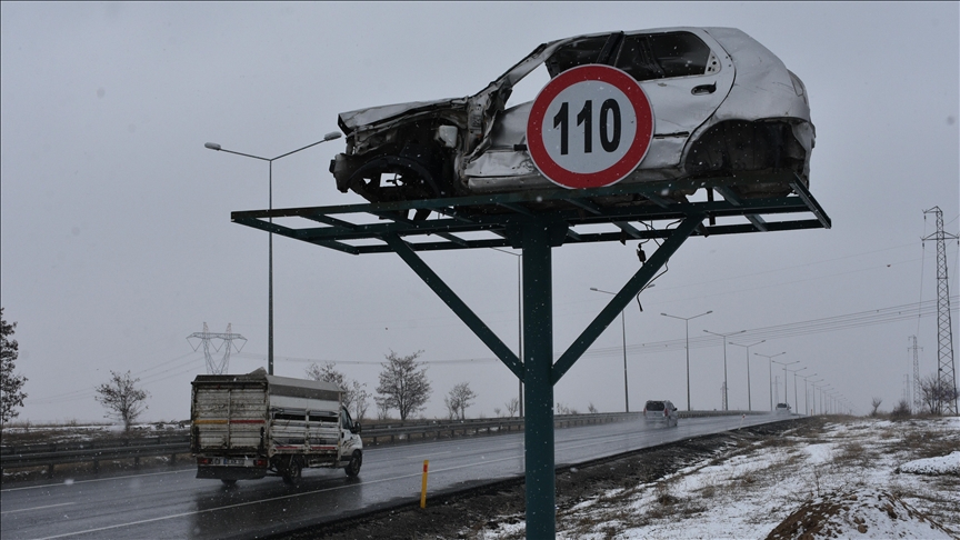 Hasarlı araçların önlerine ise azami hız sınırını, trafikte cep telefonu kullanmanın ve alkol tüketmenin yasak olduğunu bildiren levhalar konuldu.