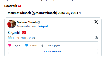 Singapur’a giderek Türkiye’nin gri listeden çıkartılması için yapılan toplantıya katılan Hazine ve Maliye Bakanı Mehmet Şimşek, sosyal medya hesabından Türk bayrağı emojili paylaşımında ‘Başardık’ dedi. Şimşek, tek kelimelik mesajında başka detay vermedi. Mali Eylem Görev Grubu (FATF), bugün Singapur’da yapılacak genel kurul toplantısında Türkiye’nin “gri listeden” çıkarılmasına ilişkin kararını açıklayacak. Açıklamanın TSİ 12.00’da gerçekleşmesi bekleniyor.