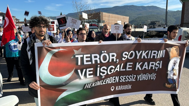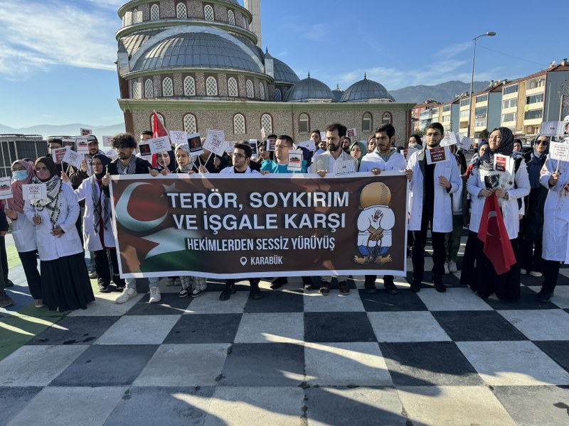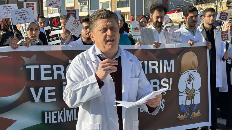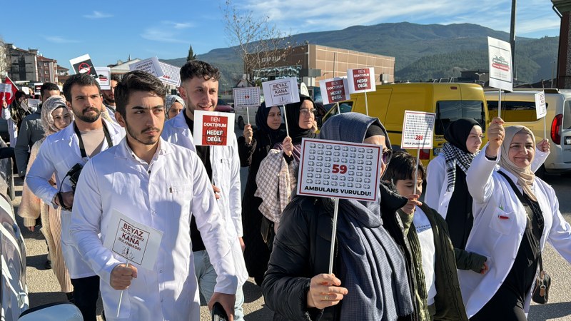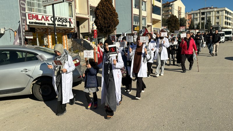 100.Yıl Mahallesi Pazaryeri Camisi önünde beyaz önlüklerini giyerek toplanan hekim ve sağlık çalışanları, ellerinde taşıdıkları Türk ve Filistin bayrakları ile dövizlerle 1003. Cadde boyunca slogan atmadan yürüdü.