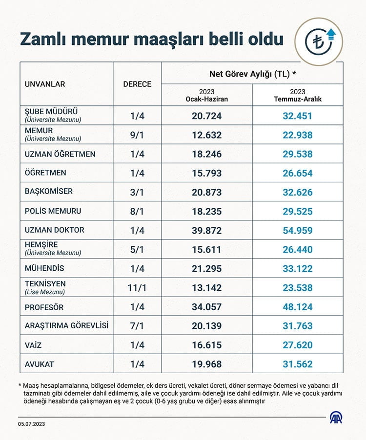 EVET TBMM DE ELE ALINACAK MEMUR MAAŞININ YASALAŞMASI HALİNDE AİLE YARDIMI ÖDENEĞİ DAHİL EN DÜŞÜM MEMUR MAAŞI 11 BİN 848 LİRADAN 22 BİN 17 LİRAYA YÜKSELECEK Buna göre, temmuz ayından geçerli olmak üzere kamu görevlileri ile memur emeklilerinin tamamının aylık ve ücretlerinde yüzde 6 artış öngörülmüştü. Bu yılın birinci 6 aylık döneminde enflasyon yüzde 19,77 olarak gerçekleşti. YAPILAN AÇIKLAMAYA GÖRE MEMUR EMEKLİLERİNE HER HANGİ BİR ZAM YAPILMAZKEN İŞÇİ EMEKLİLERİNE İSE YEDİBİN BEŞYÜZ LİRANIN ÜZERİNDE MAAŞ ALANLARA SADECE % 19,77 ORANINDA ZAM YAPILDI HÜKÜMETİMİZE VE HALKIMIZA HAYIRLI OLSUN