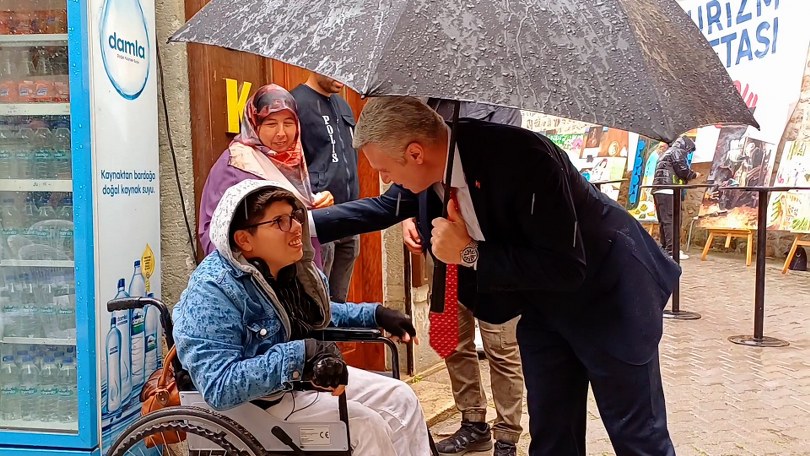 Yağmurun altında ıslanan engelli vatandaşlara Safranbolu Kaymakamı Şaban Arda Yazıcı ve Jandarma Komando Eğitim Merkez Komutanı Jandarma Kıdemli Albay Dr. Yusuf Küçükbaşol müdahale ederek ıslanmalarını önledi.