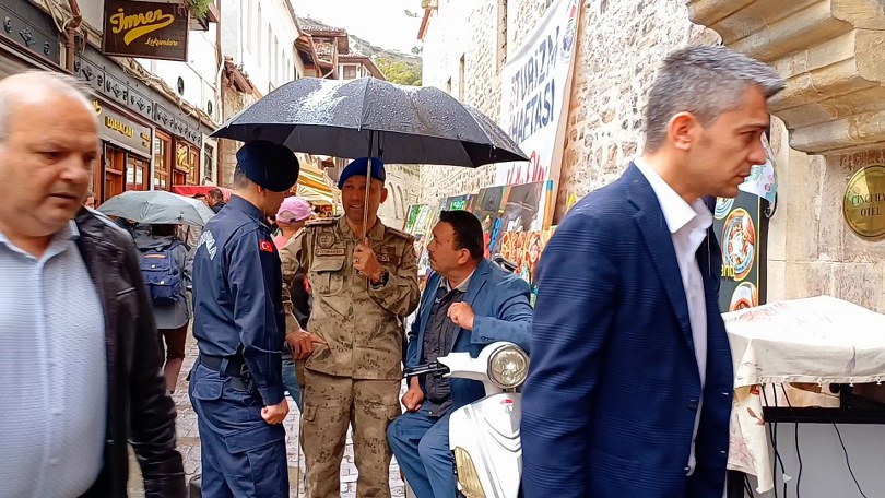 Turizm Haftası nedeniyle katılım sağlamak için etkinliğe giden Safranbolu Kaymakamı Şaban Arda Yazıcı ve Jandarma Komando Eğitim Merkez Komutanı Jandarma Kıdemli Albay Dr. Yusuf Küçükbaşol yağmurda engelli vatandaşları unutmayarak ellerindeki şemsiyeler ile vatandaşları ıslanmaktan korudu.