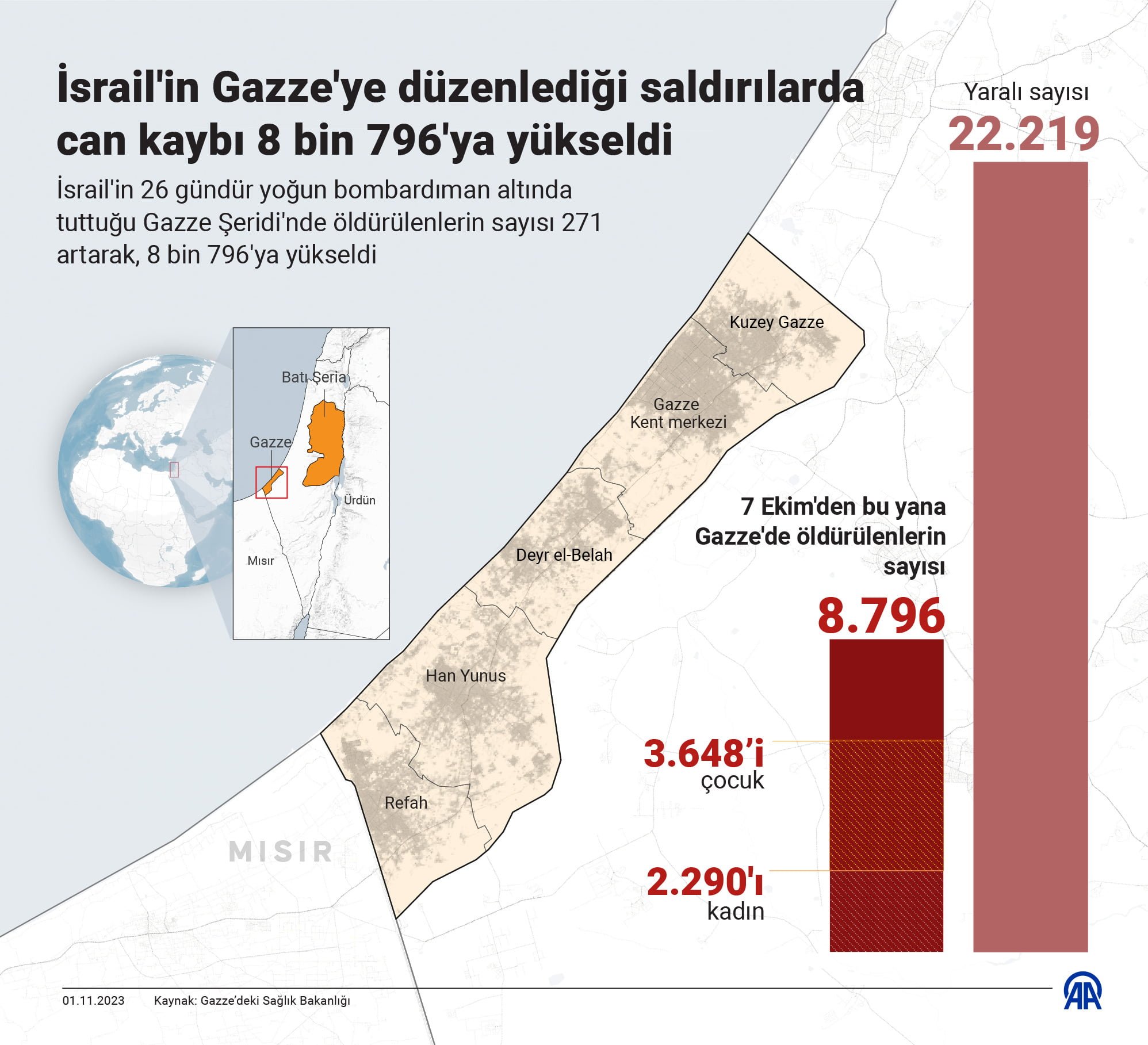 İsrail’in Gazze’ye düzenlediği saldırılarda can kaybı 8 bin 796’ya yükseldi